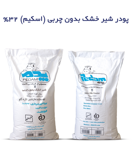 پودر شیر خشک بدون چربی 32% پدم از شیر تازه گاو که ابتدا چربی گیری و سپس پاستوریزه ، تغلیظ و به روش افشان خشک می شود ، تهیه شده است. این پودر دارای حداکثر 1/5% چربی شیر است.